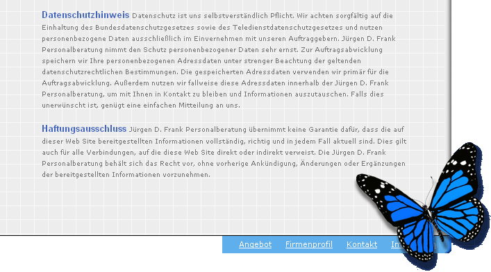 Jürgen D. Frank Personalberatung Herrn Jürgen Frank Am Wolfsberg 10 70597 Stuttgart Tel. 0711 - 722 73 09 www.jdfrank.de Websiteanalyse: Webdesign+Programmierung: W3 Statistics Free Grafikbüro brand42 Aktueller Stand der Website: Februar 2011